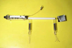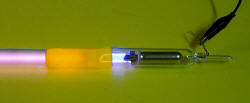 Initially when this tube was fired, it was completely striated every 1/2 inch or so and looked very dramatic. It fired at 2 kV. After a day or so sufficient outgassing had occurred to blur the striations although the Cookes space near the cathode still remains in the left photo above. The tungsten electrode is visible in the right photo with segment of yellow soda glass rather than the clear lead glass.