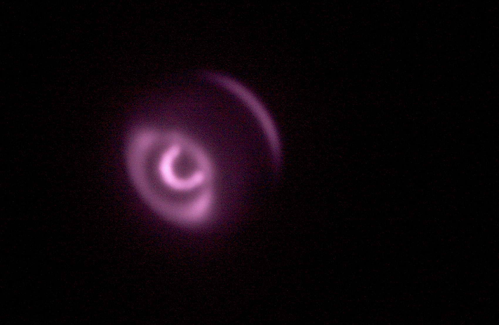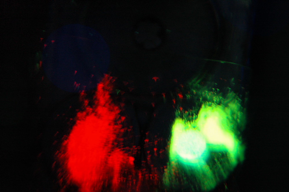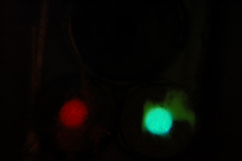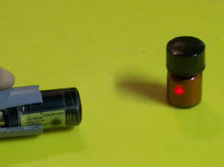 The photo above shows the red phosphorescence after shining a green laser on the bottle. This fades over seconds with a faint glow being present after minutes.