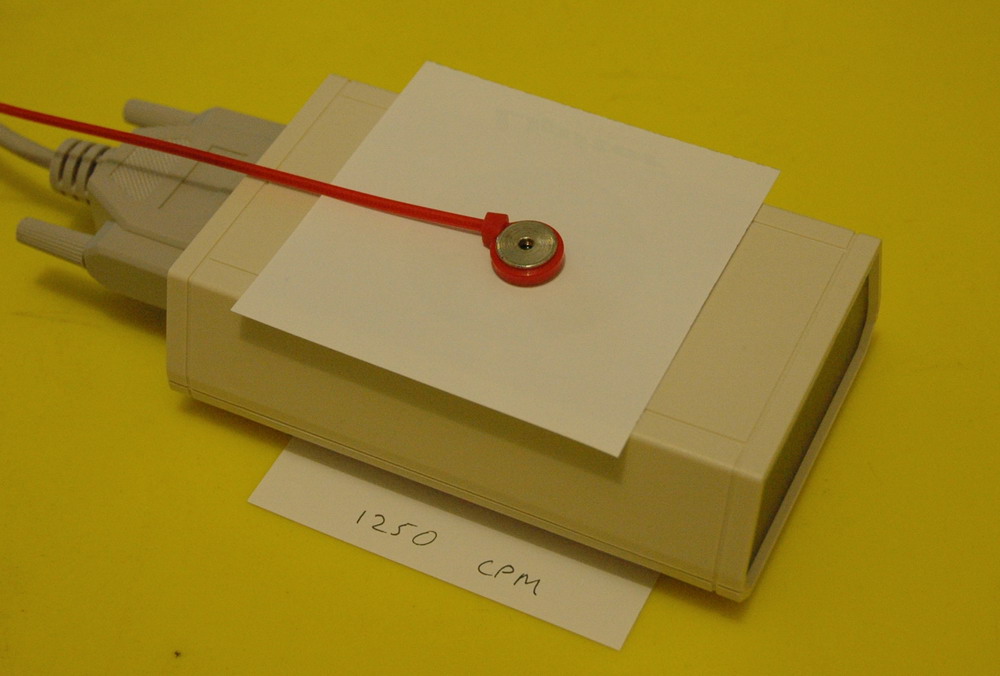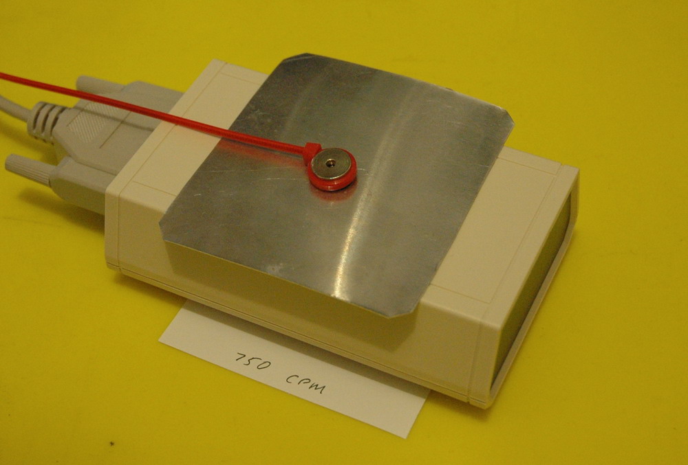 The left photo above shows an Americium sample (1 mCurie) showing a count of 80,180 CPM (counts per minute). The centre photo shows the majority of the radiation being blocked and the count dropped to 1250 CPM. The right photo shows thin Aluminium sheet dropping the count to 750 CPM. There is some gamma radiation from the Americium which may be accounting for some of this.