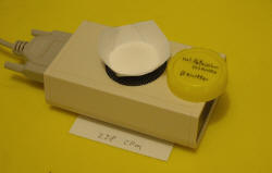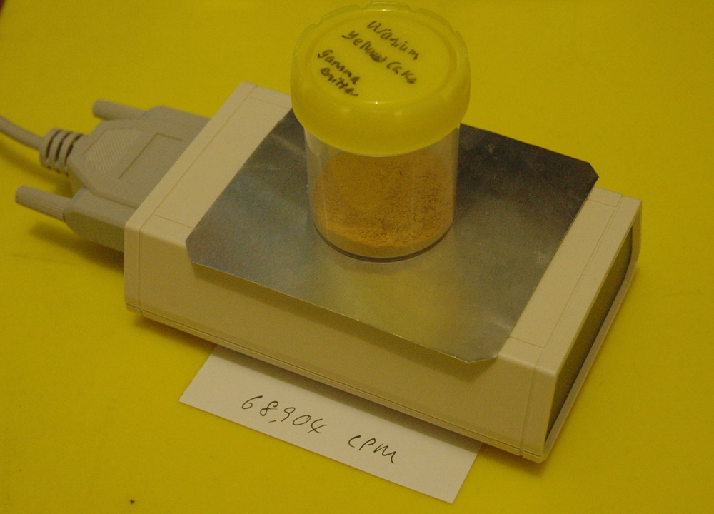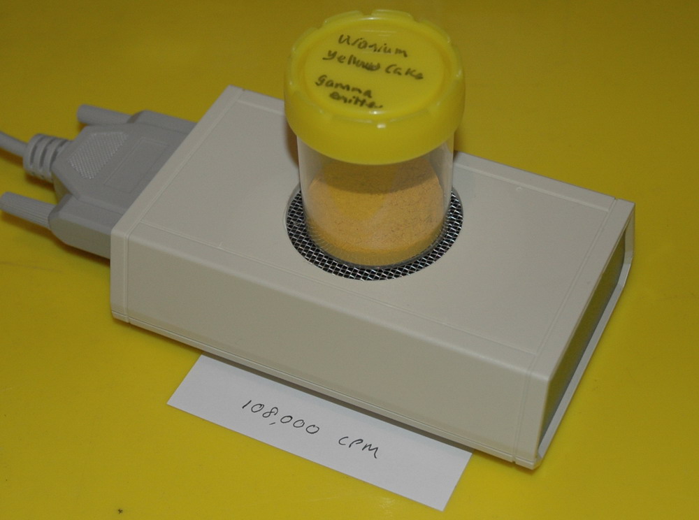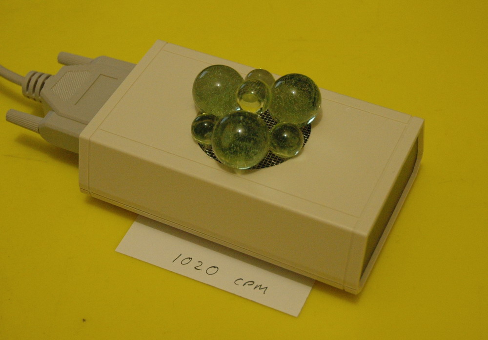 The left photo above shows a sample of Uranium ore (Yellowcake) with a count of 108,000 CPM through plastic of the container. The centre photo shows the count reduced to 68,904 CPM through aluminium. The right photo shows Uranium glass marbles with a count of 1020 CPM. These are made from old fashioned glass that fluoresces under UV and were used for glassware.