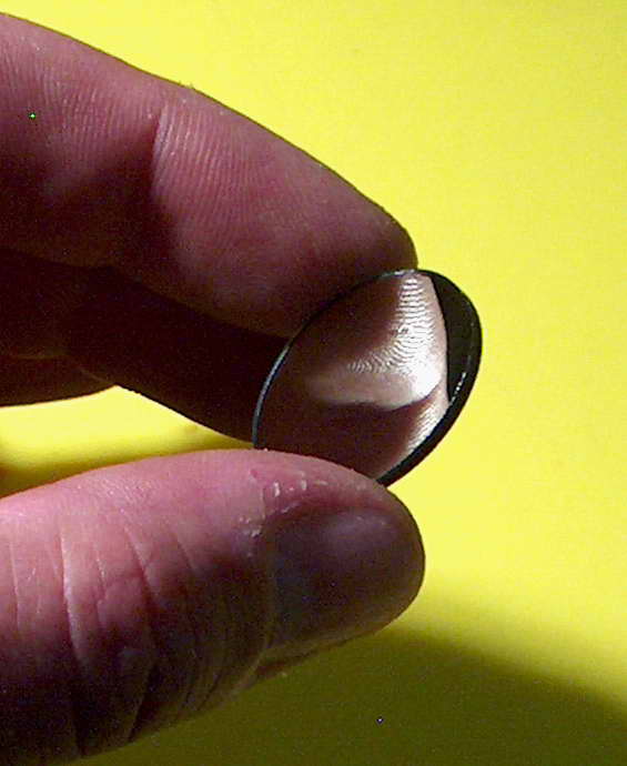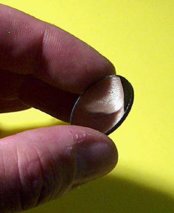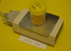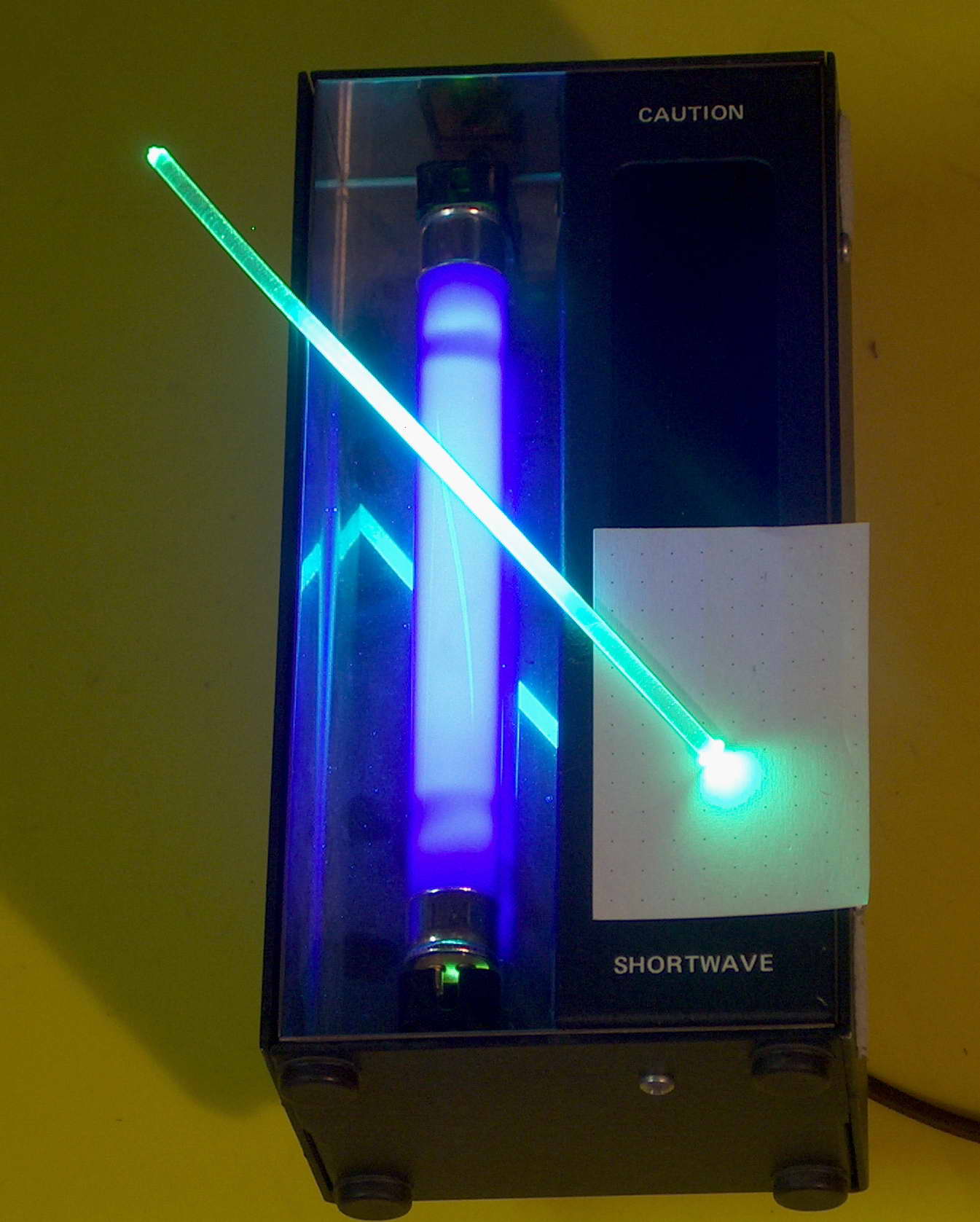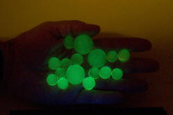 The left photo above shows my UV light making Rhodamine 6G and Fluorescine glow yellow and green respectively. The centre photo shows a fluorescent plastic rod. This picks up ambient light and pipes it towards the end. Even in faint light it does tend to be brighter than the surrounds and apparently it is used in gun sights. The UV unit is a Model 753UVA from Sirchie Fingerprint Laboratories inc. The right photo shows me with a handful of Uranium marbles. Uranium glass glows green with UV and was popular for glassware early last century and in Cookes tubes.