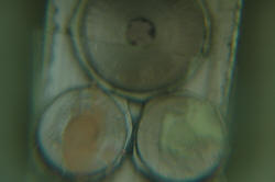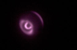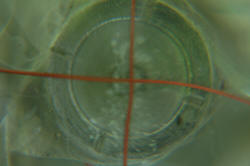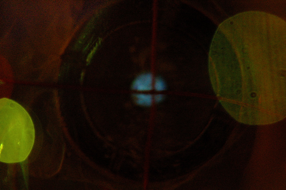 The left photo above shows a close up of an Americium source. The central part of the disk is 2 mm diameter. I think this has TV screen phosphor on sticky tape and some cross hairs over that. The right photo above shows an 8 minute exposure with the phosphor showing up blue. The red background and green lens flares are from LED's that were on in the room.