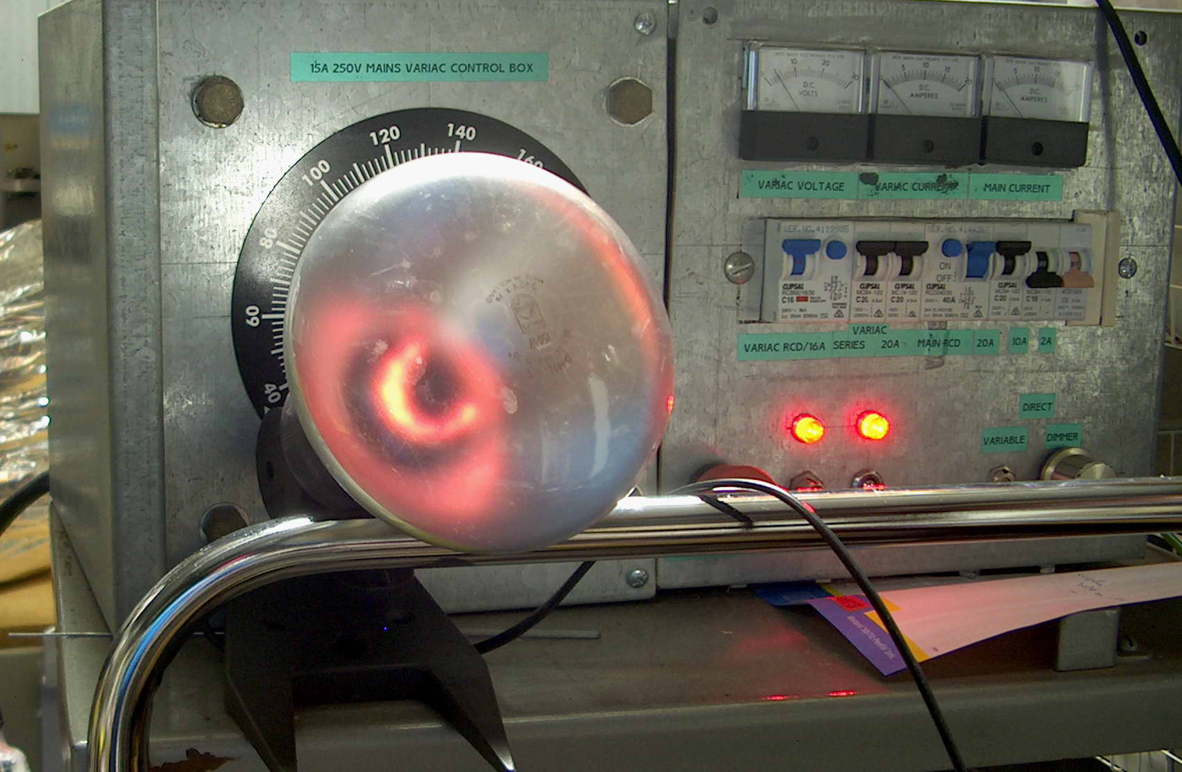 The left photo above shows a 150 W globe is shown in visible light and the centre photo shows it in infrared. The LED indicator lights and the reflected fluorescent lighting don't emit infrared . The right photo shows the filter with its gold reflective coating.