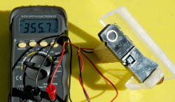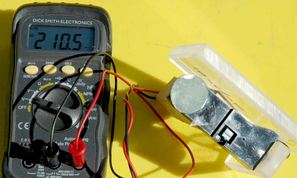 The left photo above shows a silicon laser meter that reads 10 mV per mW. Hence if you shine a 1mW laser pointer at it you get 10mV out. The detector is 7mm x 7mm ie 47mm2. It is reading 35 mW of sunlight on that surface in late afternoon sun. This is equivalent to 710 W/m2. Sunlight at noon is generally thought of as 1000 W/m2 so that is pretty close. The right photo shows the infrared filter above which still allows 21 mW/mm2 or 440 W/m2. Hence this experiment suggests that 62% of sunlight radiated power that we receive is infrared.