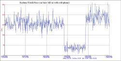 The left photo above shows a watch face with radium/phosphor painted numbers dates from the 1930's and I can still see a faint glow with dark adapted eyes over 70 years later. Too dark for the camera though. The loss of glow is due to damage to the phosphor not due to loss of radioactivity from the Radium 226 which has a half life of 1600 years. The right graph shows the radiation when placed on my Geiger counter. The left side of the trace shows the count of perhaps 260 CPM with the protective cellophane off. The lower trace in the middle is background of about 60 CPM and the right trace is with cellophane back on which surprisingly reads higher. I presume that this is a positioning artifact rather than a moderating effect of the cellophane.