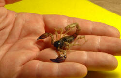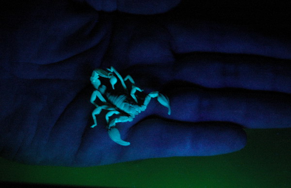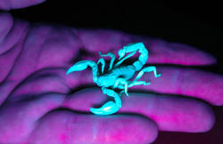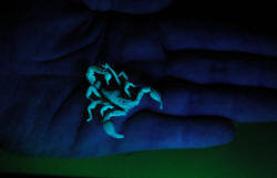 The left photo above shows the scorpion under normal light and the right photo shows it brightly fluorescing under a standard UV fluorescent tube. Apparently most scorpions are like this. The only part that does not is the very tip of the sting if you look at the enlarged photo.