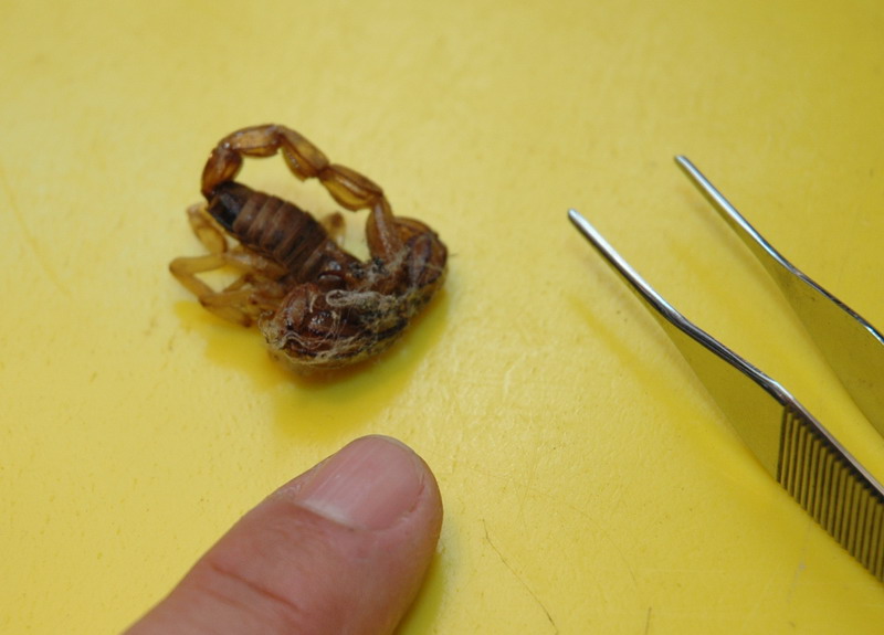The photo above shows a small (dead) scorpion that I found in a spiders web, bound up. I carefully unpicked the web, steamed the scorpion to loosen and reposition the limbs into a more natural pose.