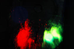 The left photo above shows three Americium sources. All about 0.9 to 1.0 microCurie. The top one has no phosphor, the left lower one has Strontium Aluminate:Europium 2% (see below) and the right lower one has activated Zinc Sulphide. The middle photo shows the colour not restricted to the emitter, so this is due to phosphorescence not the alpha radiation. The right photo above shows the same 8 minute exposure but after the lights had been out for hours. The effect of the radiant emitter is clearly seen with fluorescence of both.