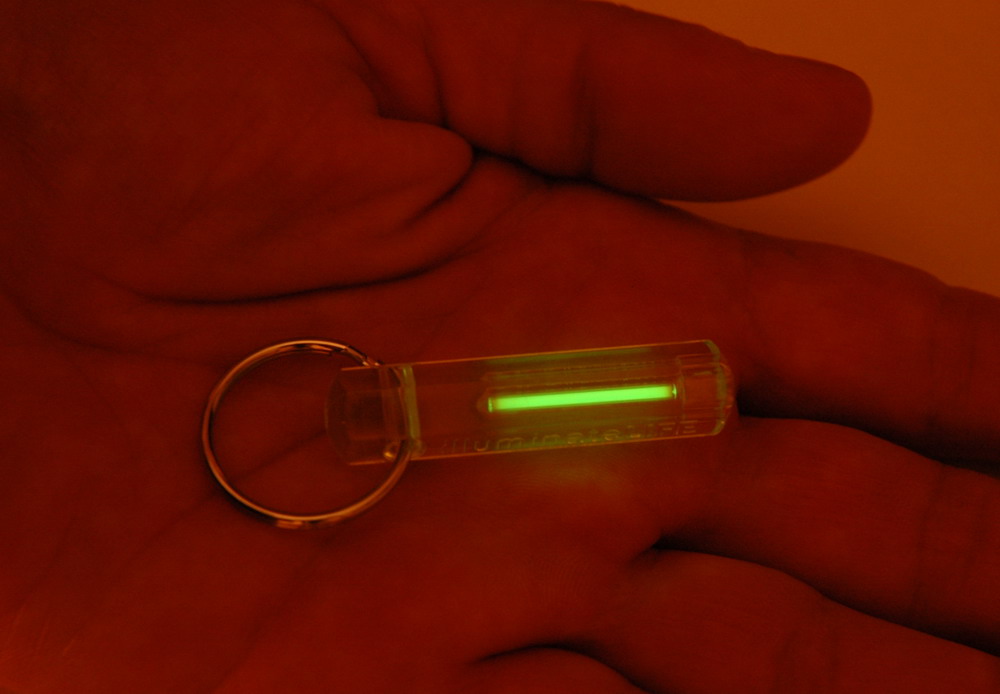 This key ring attachment, above left, has a tritium core in a laser sealed glass tube which is phosphor coated and can be bought on eBay for about $10. The right graph shows the radiation output compared with background.