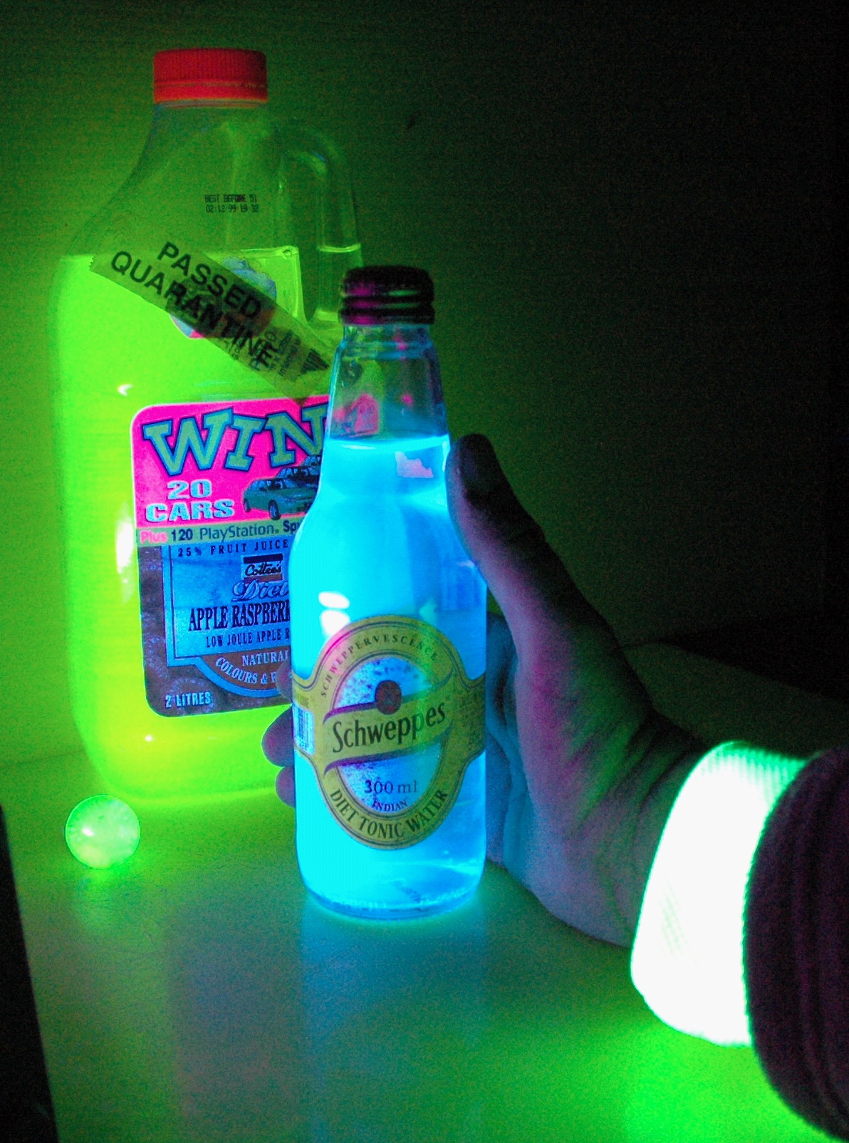 The photo above shows a standard tonic water bottle which is fluorescent.